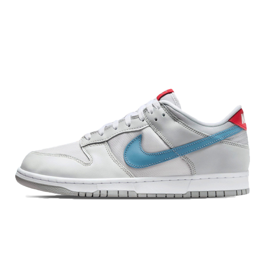 A cipő felsőrésze metálfényű ezüstös bőrből és texturált hálós betétekből készült, amelyek nemcsak esztétikailag különlegesek, de kiváló szellőzést is biztosítanak. A fő színvilágot a Silver, Light Iron Ore és Phantom Grey tónusok alkotják, amit egy mélykék (Aegean Blue) Swoosh logó és piros részletek egészítenek ki a nyelvcímkén és a sarok hátoldalán. A fényes, fémes hatás valóban futurisztikus külsőt kölcsönöz a cipőnek, miközben megőrzi a Nike Dunk Low időtálló formavilágát.