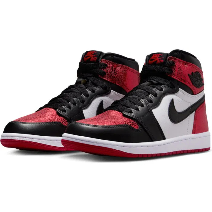 Az „OG” az eredeti, magas szárú kialakítást jelöli, amely méltó a Jordan márka legendás örökségéhez – ez a „Ruby” változat tiszta fehér alapon futó oldalfelülettel, erőteljes „Varsity Red” piros panelokkal és megerősített fekete elemekkel érkezik. A piros bőrpanelek különösen feltűnőek: repedezett (!) textúrát kaptak a tetején és sarokrészen, ami extra karaktert ad a modellnek és frissíti az AJ1 család ikonikus vonalait.