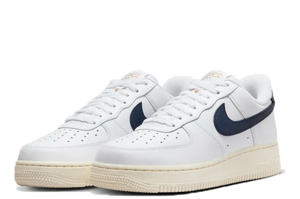 A „Olympic” kiadás egy elegáns és sportos színvilágot képvisel: a domináns fehér bőrfelsőrészt metál arany, sötétkék (Obsidian) és világos elefántcsont árnyalatok egészítik ki. Ezek a tónusok nemcsak harmonikusan illeszkednek egymáshoz, hanem visszafogottan utalnak az olimpiai színekre, így különösen aktuális és szimbolikus választás lehet sportos lelkületű vásárlók számára. A cipő sarkán található arany díszítés és a kontrasztos sötétkék részletek finoman emelik ki a modell különlegességét.