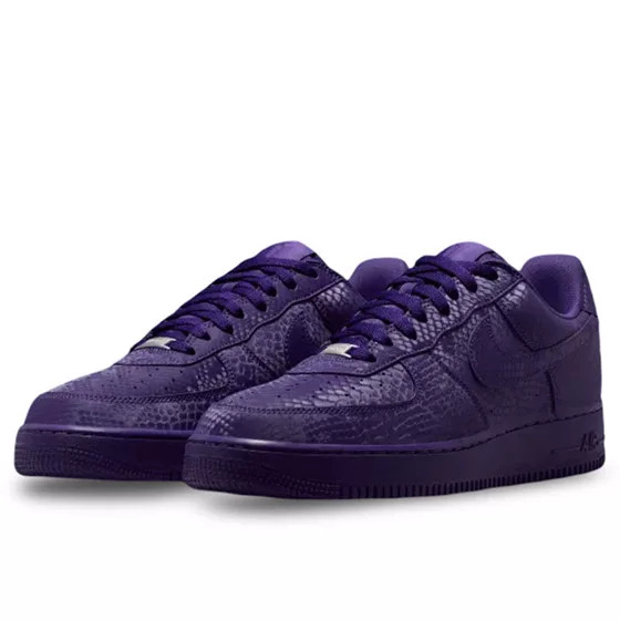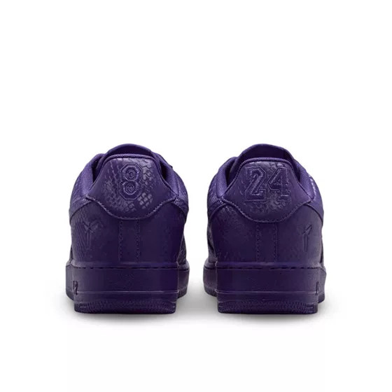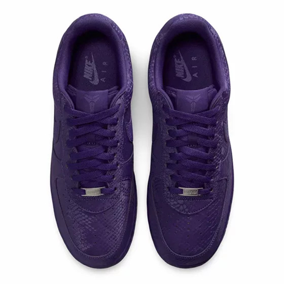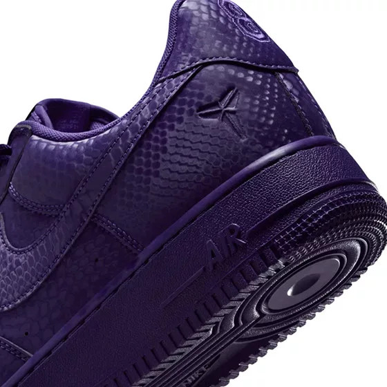 A cipő alapját a jól ismert Air Force 1 Low sziluett adja, amely évtizedek óta meghatározó szereplője az utcai divatnak. A Court Purple színvilág egy erőteljes, monokróm megjelenést biztosít, amely Kobe Bryant Los Angeles Lakers korszakára utal, miközben elegáns és letisztult összképet nyújt. A felsőrész prémium bőrből készült, amelyet teljes felületen kígyóbőr mintázat borít, utalva Kobe becenevére és játékstílusára.