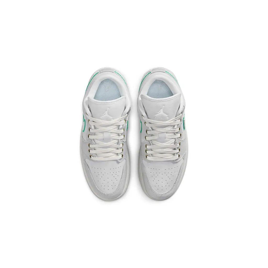 A színösszeállítás visszafogott, mégis karakteres: „Light Smoke Grey / Summit White / Pure Platinum” árnyalatok dominálnak, ami modern és letisztult megjelenést kölcsönöz. A felsőrész anyaghasználata prémium minőségű: a bőr dominál, de textil és velúr jellegű panelek is feltűnnek, különösen a koptatott részletek mentén, melyek egyediséget visznek a cipőbe. Az ikonikus „Wings” logó a sarokrészen és a „Jumpman” márkajelzés a nyelven erős márkaidentitást biztosít, miközben az alacsony szárú („Low”) kialakítás kényelmes és sportos viseletet kínál.